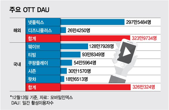 '티빙'의 성공적인 성장세에 힘입어 작년 기준이지만 데이터 분석 플랫폼 모바일 인덱스에 따르면 두 달 전인 2021년 12월 13일 기준으로 넷플릭스 독주에 비해 한국에서 죽 쑤고 있는 디즈니 때문에 토종 OTT연합의 일간 활성 이용자 수가 앞서기도 했다. 두 달이 흐른 지금은 아무래도 넷플릭스 '지금 우리 학교는' 이 대박을 치고 있기 때문에 밀리고 있을 것이겠지만 이 같은 '티빙'의 성장은 상당히 고무적이다.